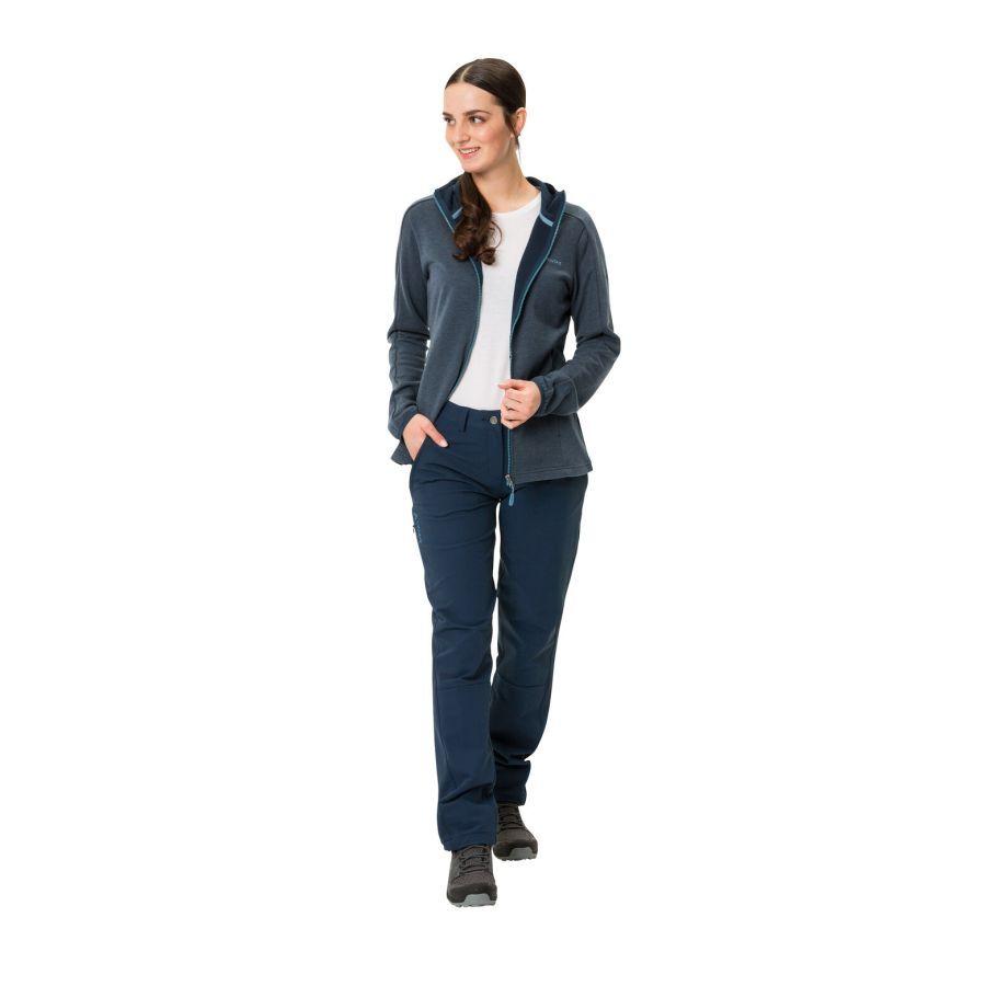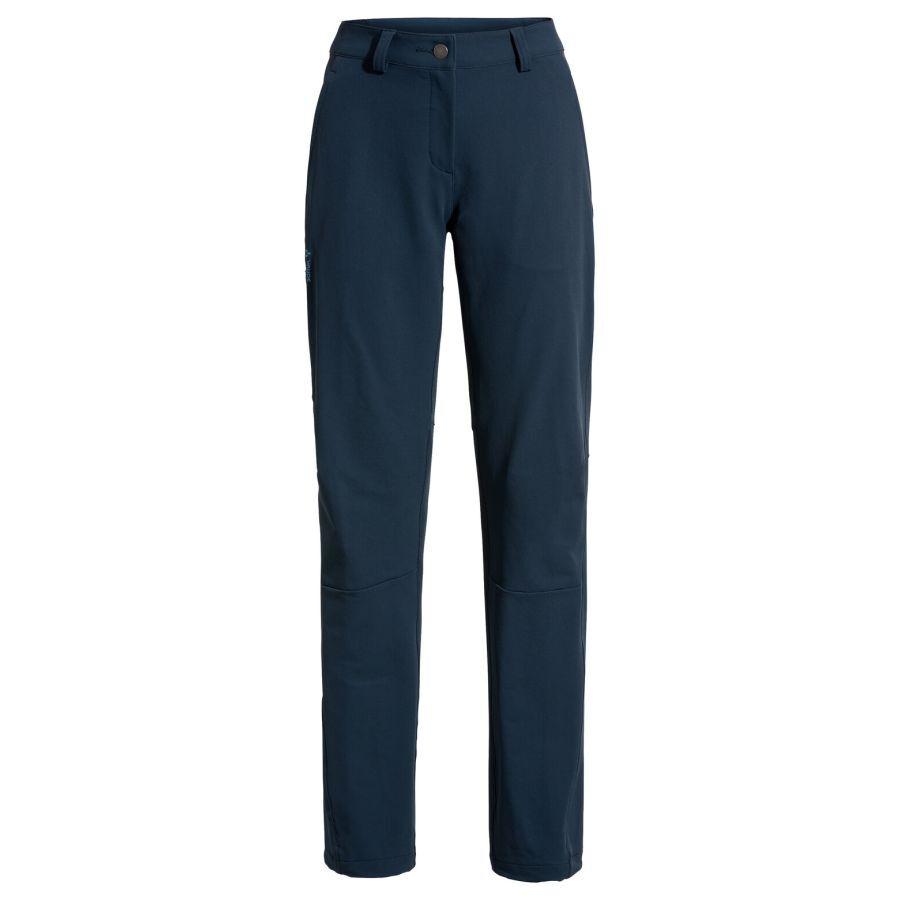 Comfortable, durable, and versatile: the new version of the Strathcona Pants II hiking trousers features a more ergonomic and updated cut. The bottoms of the legs can also be adjusted in width using a drawstring. The robust, double-woven fabric is made from recycled material and moves with you thanks to its high elastane content. It is essential for short climbing routes while hiking or during trekking trips. The women's hiking trousers are ultra windproof yet highly breathable, contributing to a pleasant body climate. Similar to a softshell, the trousers have slanted pockets with invisible zips, a side pocket, and a rear pocket. These trousers are treated with the eco-friendly and PFC-free Eco Finish, can easily withstand light rain and snowfall, and dry quickly. The Green Shape label from VAUDE guarantees an eco-friendly product that is functional and made from sustainable materials certified by bluesign®.